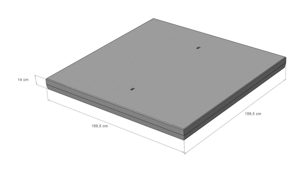 Deze betonplaat is 200 x 200 x 14 cm, en heeft een aslast van 15 Ton. De plaat is gemaakt met enkele wapening en betonkwaliteit C45/55. Hij heeft een toplaag: Gebezemd. Deze plaat draagt het KOMO-keurmerk en CE keurmerk.